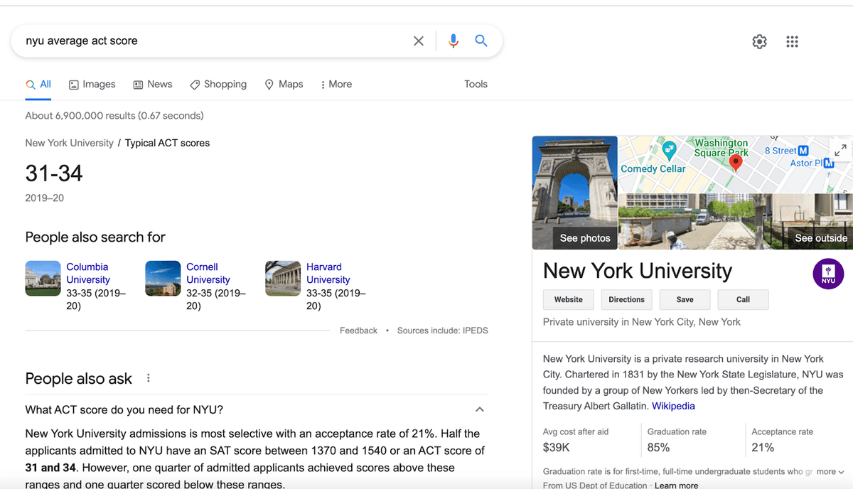 For example, let’s say you want to get admitted into NYU. In this case, you can simply open a google search and type “NYU average ACT score” and usually get a reasonably reliable answer. We also have resources for Ivy League colleges, the hardest colleges to get into, and the easiest colleges to get into that includes ACT scores.